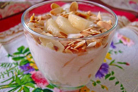 Birnencreme ist ein leichtes und erfrischendes Dessert. Es besteht aus einer cremigen Birnenbasis und wird mit frischen Birnen und Joghurt serviert. Hier ist das Rezept: